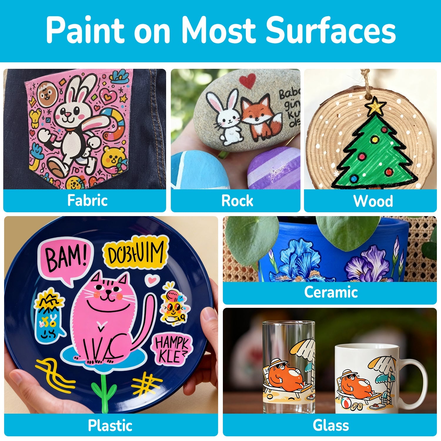 🌟 Premium, Long-Lasting Results: The high-density acrylic ink delivers vibrant, opaque coverage that adheres permanently and weather-resistantly on wood, canvas, metal, glass, ceramic, stone, and plastic.